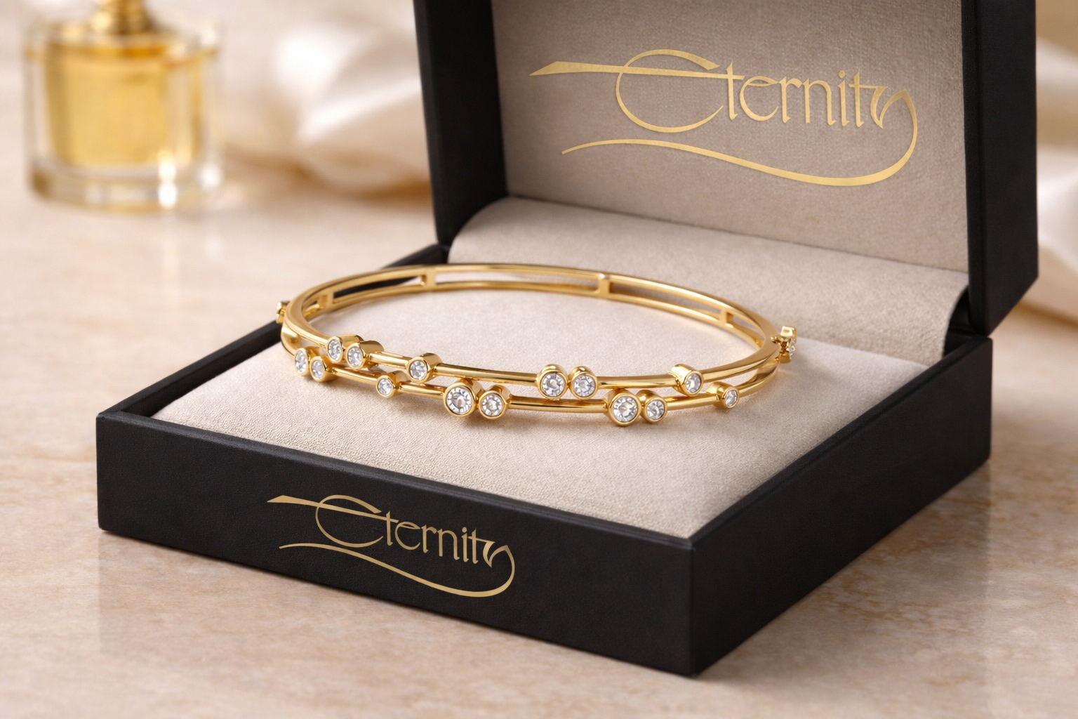This 18ct Yellow Gold Fancy Diamond Bangle exudes elegance and sophistication. Crafted from premium quality gold and adorned with radiant diamonds, it is the perfect accessory for any luxurious ensemble. Embodying the essence of art and style, this bangle is a must-have for the fashion-forward individual.
