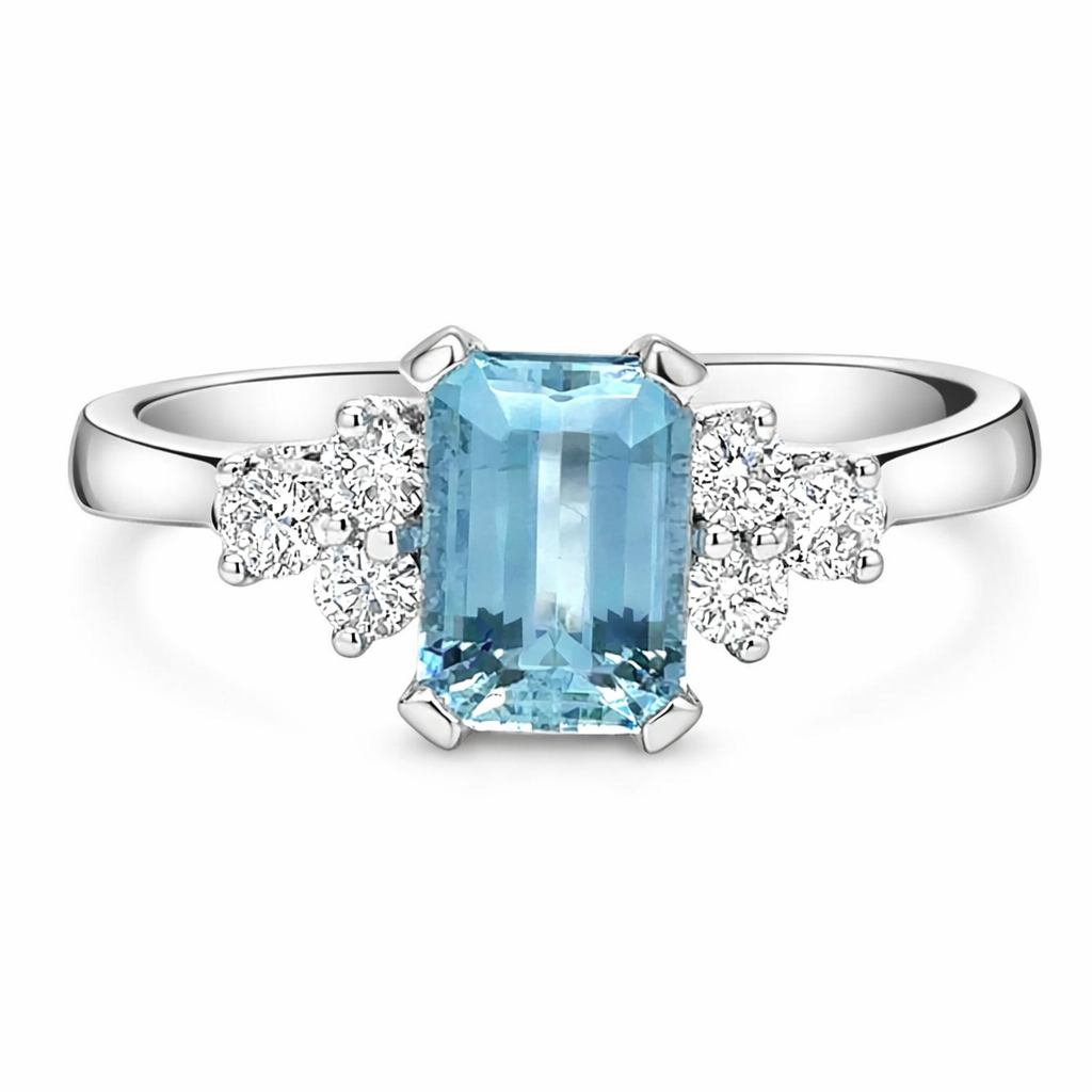 Emerald Cut Aqua & Trefoil Diamonds Engagement Ring