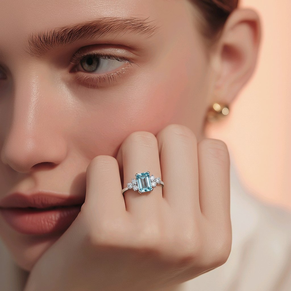 Sparkle your way into forever with our stunning Emerald Cut Aqua & Trefoil Diamonds Engagement Ring. The vibrant emerald cut aqua centre stone is accentuated by delicate trefoil diamonds, creating a breath-taking statement of love and commitment. Make her dreams come true with this exquisite ring.