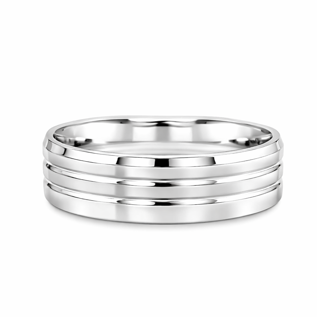 Flat Court Wedding Band With 2 Lines & Bevelled Edges