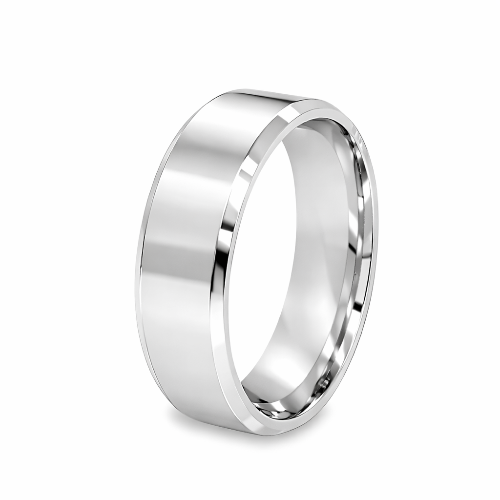 This beautifully crafted wedding band boasts a sleek and modern flat court design, with a luxurious matte centre and elegant bevelled edges. Its refined and timeless style adds a touch of sophistication to any ring finger, making it the perfect symbol of enduring love and commitment.