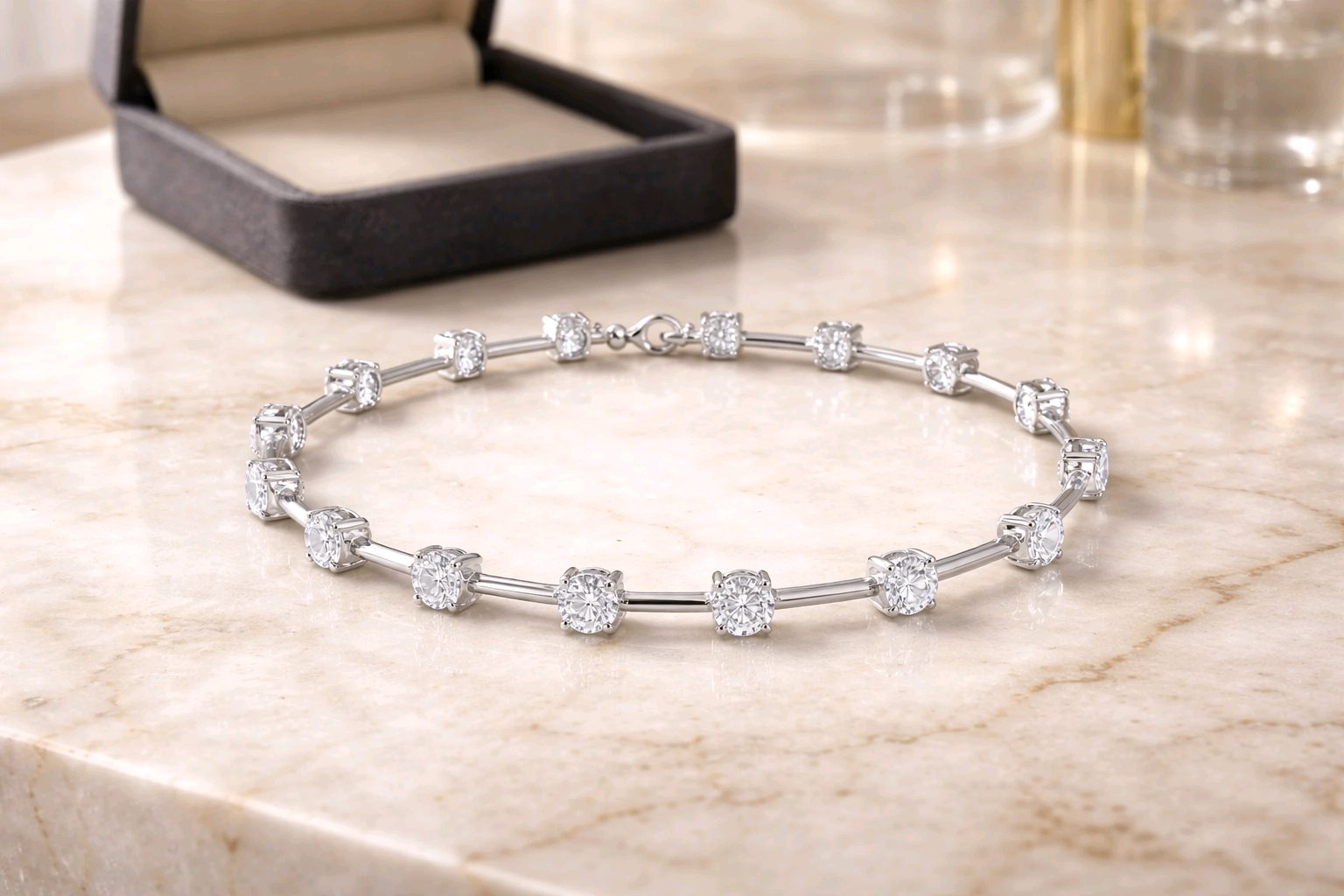 Crafted with precision, this lab-grown diamond bracelet features a stunning 4.30ct total round brilliant cut stones set in a refined design. The lab-grown diamond offers exceptional clarity and brilliance while providing an ethical, sustainable alternative to mined diamonds. Perfect for those seeking luxury with conscience, this piece combines timeless elegance with modern values. An investment in beauty that makes a difference.