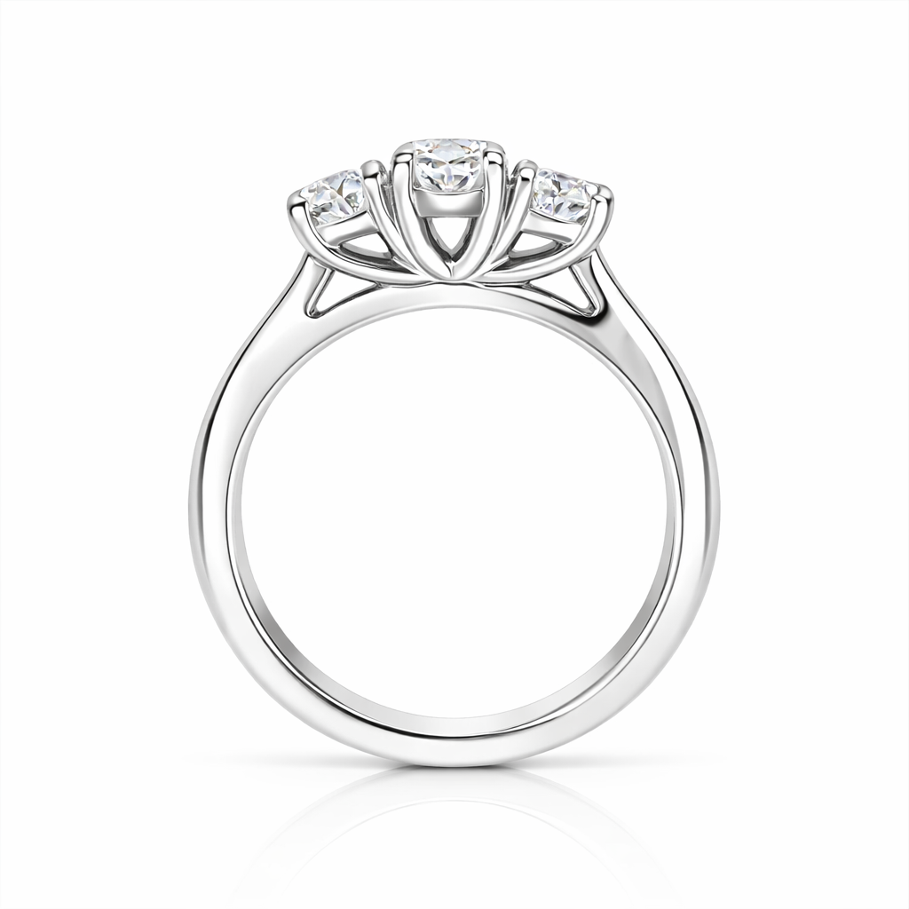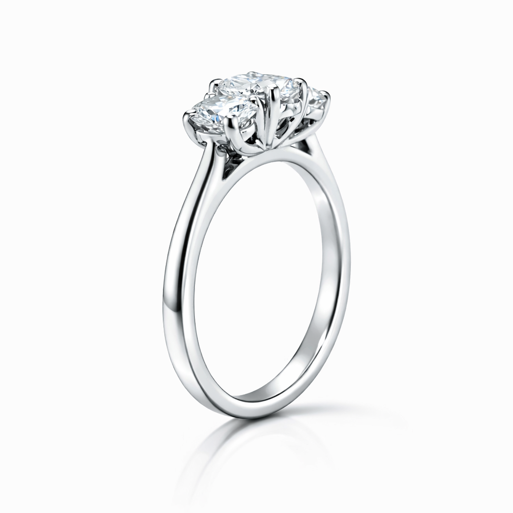 Celebrate your love with this elegant trilogy engagement ring, featuring a stunning 0.50ct oval cut diamond at its heart, flanked by matching oval cut diamond side stones. The harmonious arrangement of three brilliant diamonds creates a timeless, sophisticated look that captures light beautifully from every angle. Crafted with precision and attention to detail, this ring combines classic design with contemporary elegance, making it the perfect symbol of your commitment. Ideal for those who appreciate refined style and the enduring beauty of diamond jewellery.