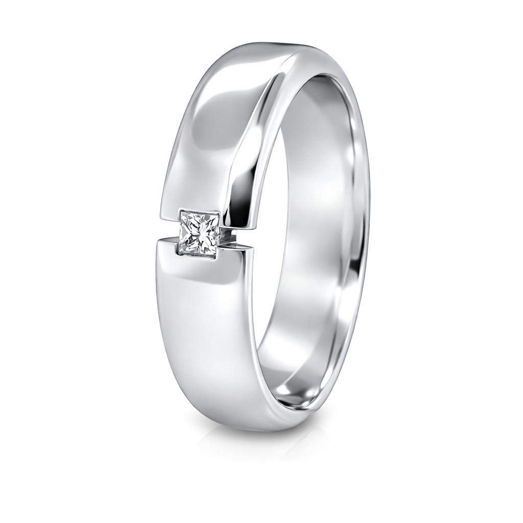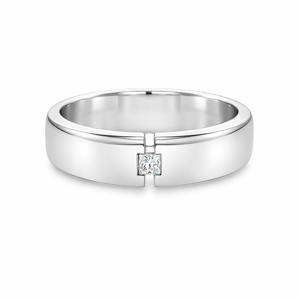 Unleash the power of elegance with our Platinum Flat Wedding Band. Featuring a single Princess Cut Diamond, this band exudes simplistic beauty and timeless charm. Elevate your special day with a ring that will symbolize your love for eternity.