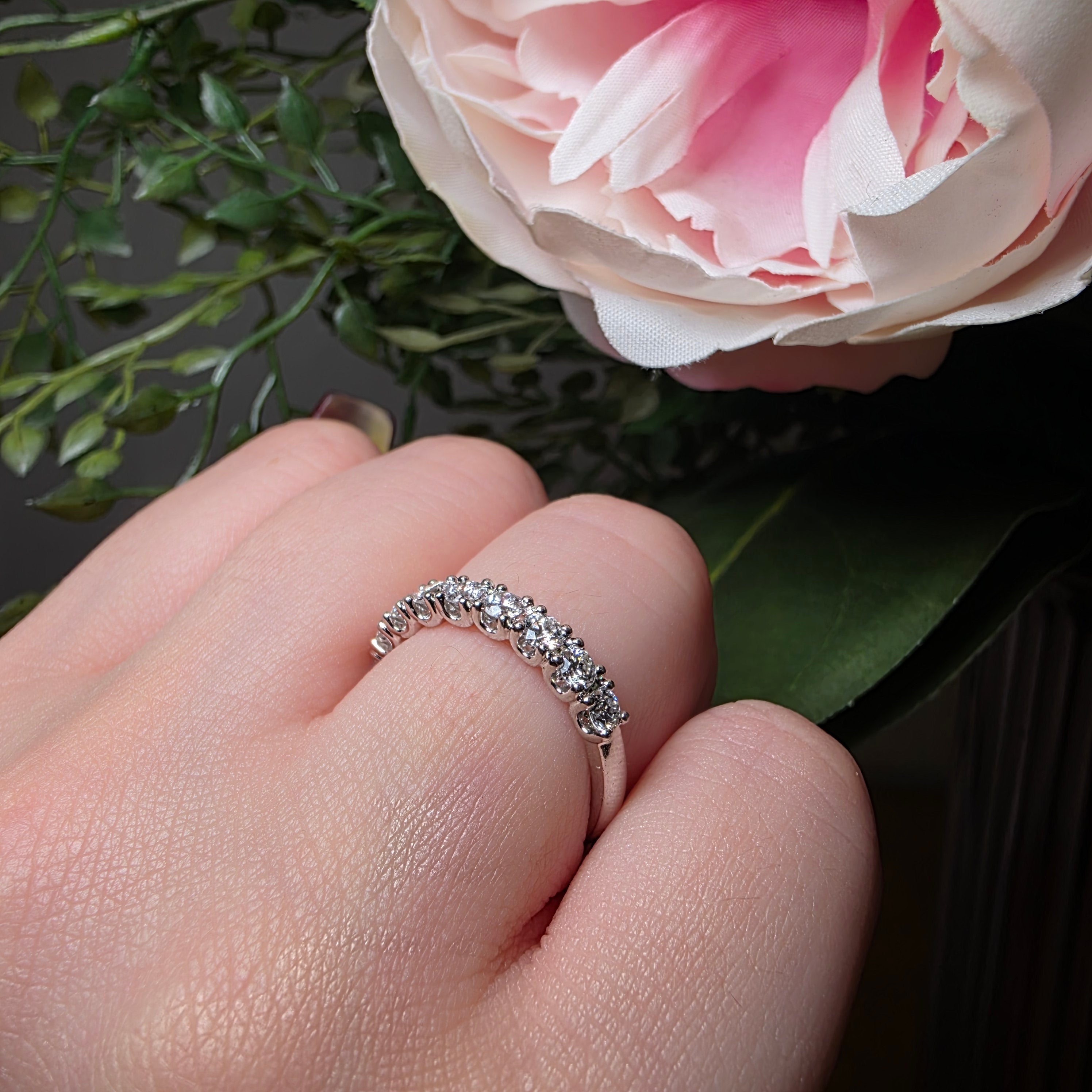 Celebrate forever with this stunning 9-stone eternity ring, featuring a mesmerising 0.69ct round brilliant cut diamond at its heart. Each stone catches the light with brilliant sparkle, creating an endless circle of radiance around your finger. Perfect for marking life's most precious moments or simply treating yourself to timeless elegance. This classic design promises to turn heads and steal hearts—yours included. A true showstopper that'll have everyone asking where you got it.