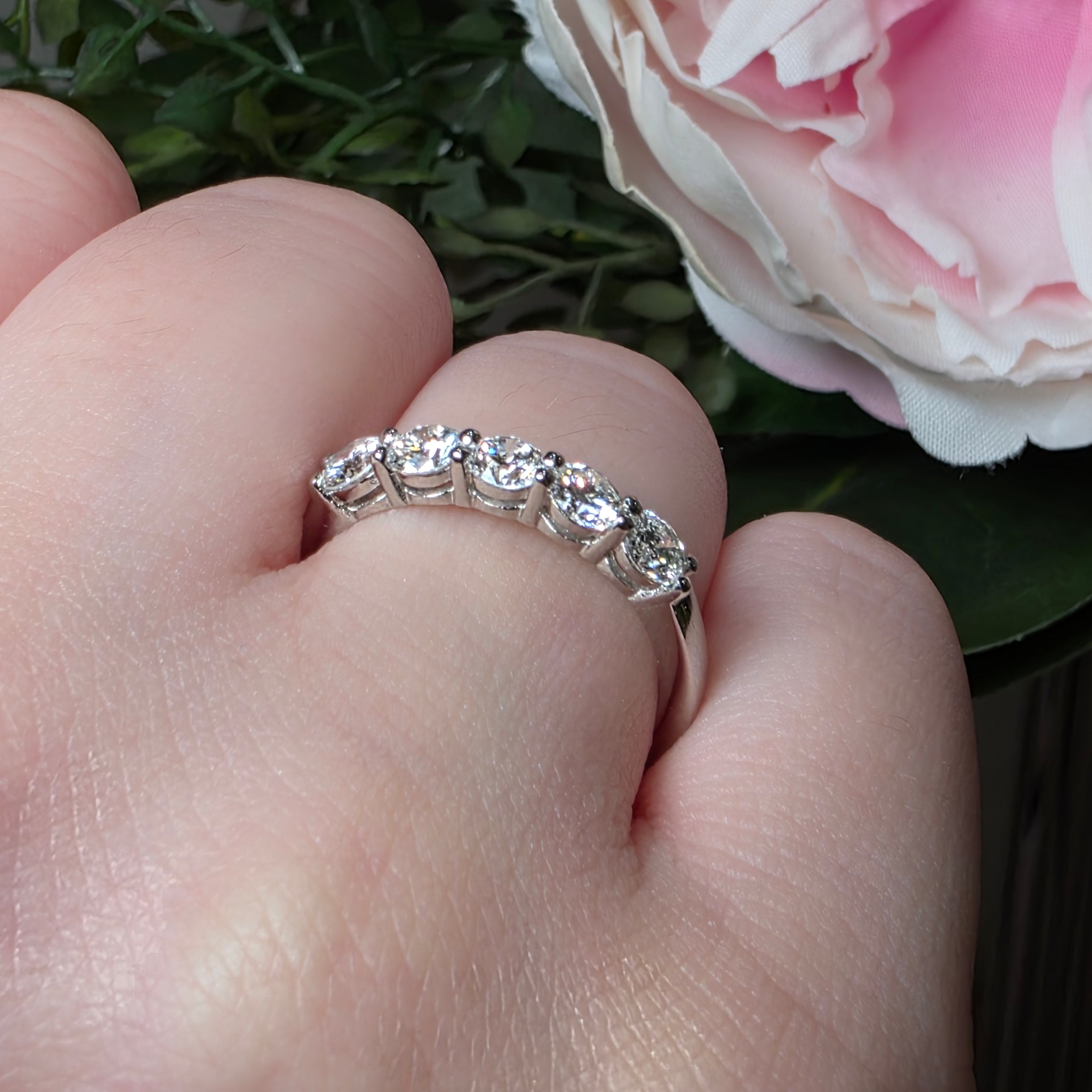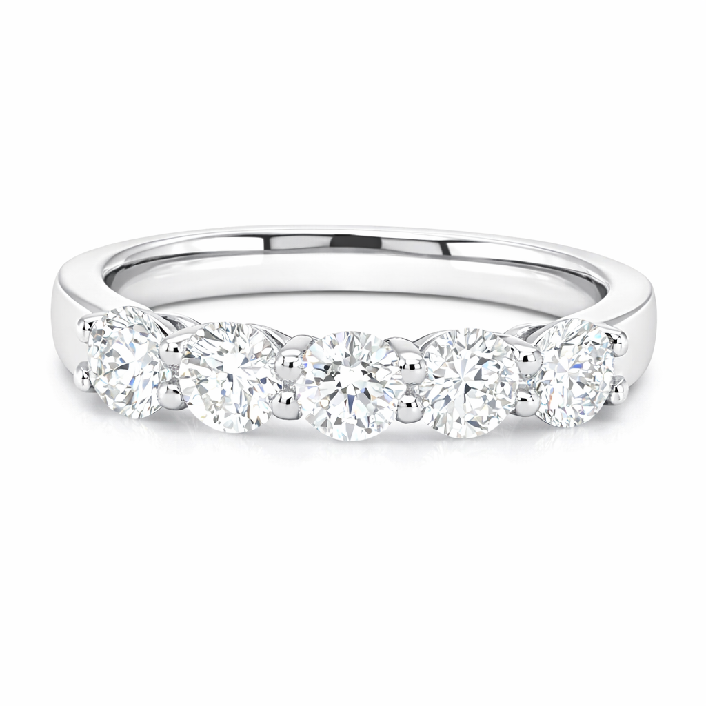 Timeless elegance meets everyday sparkle with this stunning 5 stone eternity ring, featuring a captivating 0.86ct round brilliant cut diamond at its heart. Each stone is expertly set to catch and reflect light from every angle, creating a mesmerising display of brilliance that celebrates your most precious moments. The classic eternity design symbolises enduring love and commitment, while the superior cut quality ensures maximum radiance and fire. Perfect as an engagement ring, anniversary gift, or a luxurious treat for yourself, this piece combines sophisticated craftsmanship with investment-grade diamonds. A jewel that transcends trends and becomes a cherished heirloom.
