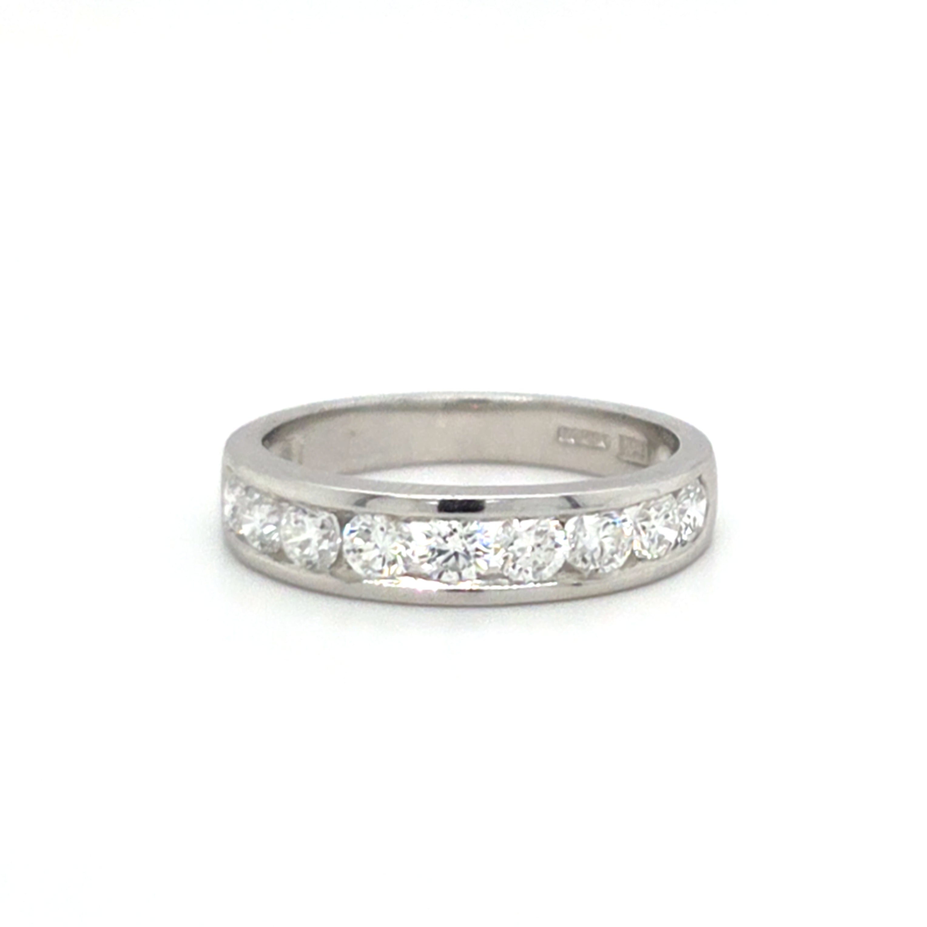 Round Brilliant Cut 1.00ct Diamond 9 Stone Eternity Ring This elegant eternity ring features a stunning 1.00 carat round brilliant cut diamond as its centrepiece, complemented by eight additional diamonds set in a continuous band. The round brilliant cut maximises light return and sparkle, whilst the nine-stone design creates a sophisticated, timeless aesthetic. Expertly crafted to showcase exceptional brilliance and fire, this ring represents a classic choice for those seeking enduring elegance and refined craftsmanship in fine jewellery.