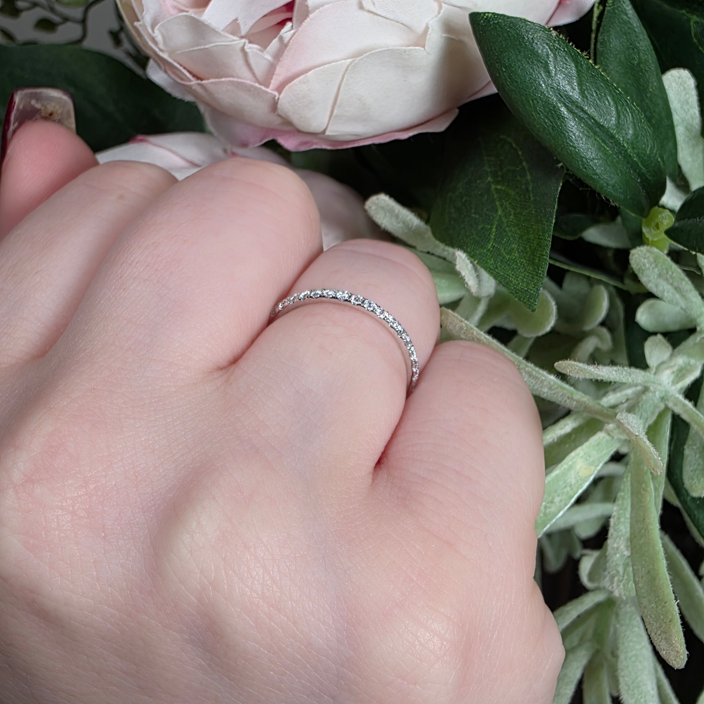 Round Brilliant Cut Diamond Full Hoop Microset Wedding Band 1.5mm This exquisite wedding band features a continuous line of round brilliant cut diamonds meticulously set using microset technique along the entire hoop. The 1.5mm profile offers a refined, understated elegance that complements both solitaire engagement rings and worn alone. Each diamond is precisely positioned to maximise light return and brilliance, creating an uninterrupted sparkle that catches the eye from every angle. The microset setting provides secure, durable stone placement whilst maintaining the band's delicate aesthetic. An ideal choice for those seeking timeless sophistication with substantial diamond presence.
