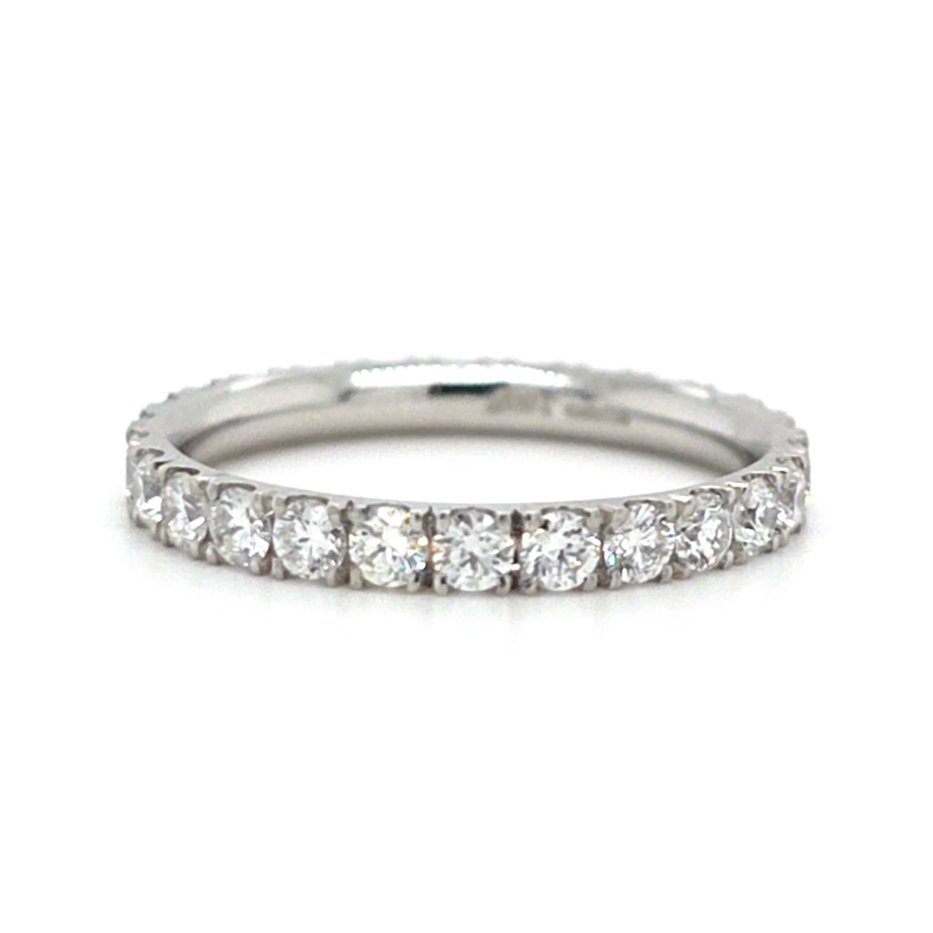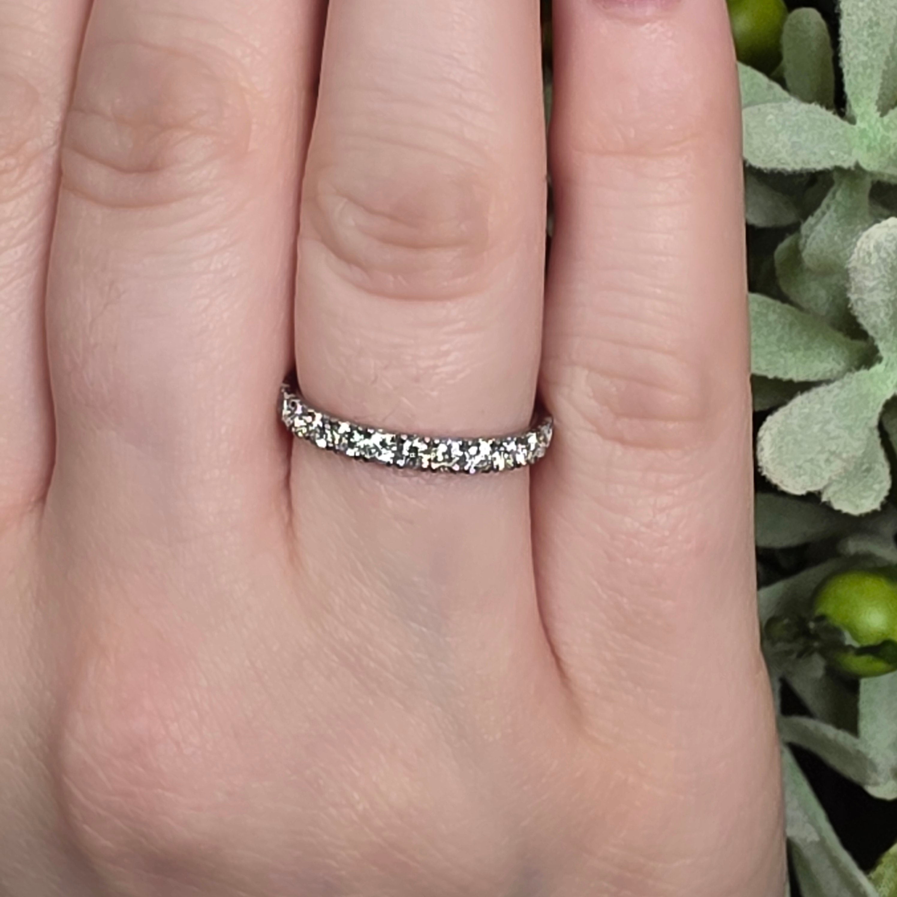 Slip into forever with this dazzling full hoop wedding band, where tiny round brilliant diamonds sparkle all the way around. At just 2.4mm, it's delicate enough to stack with your engagement ring or wear solo for understated glamour. Each stone is expertly microset to catch the light from every angle, creating a continuous shimmer that'll have you admiring your hand all day long. Perfect for those who believe more sparkle equals more joy.