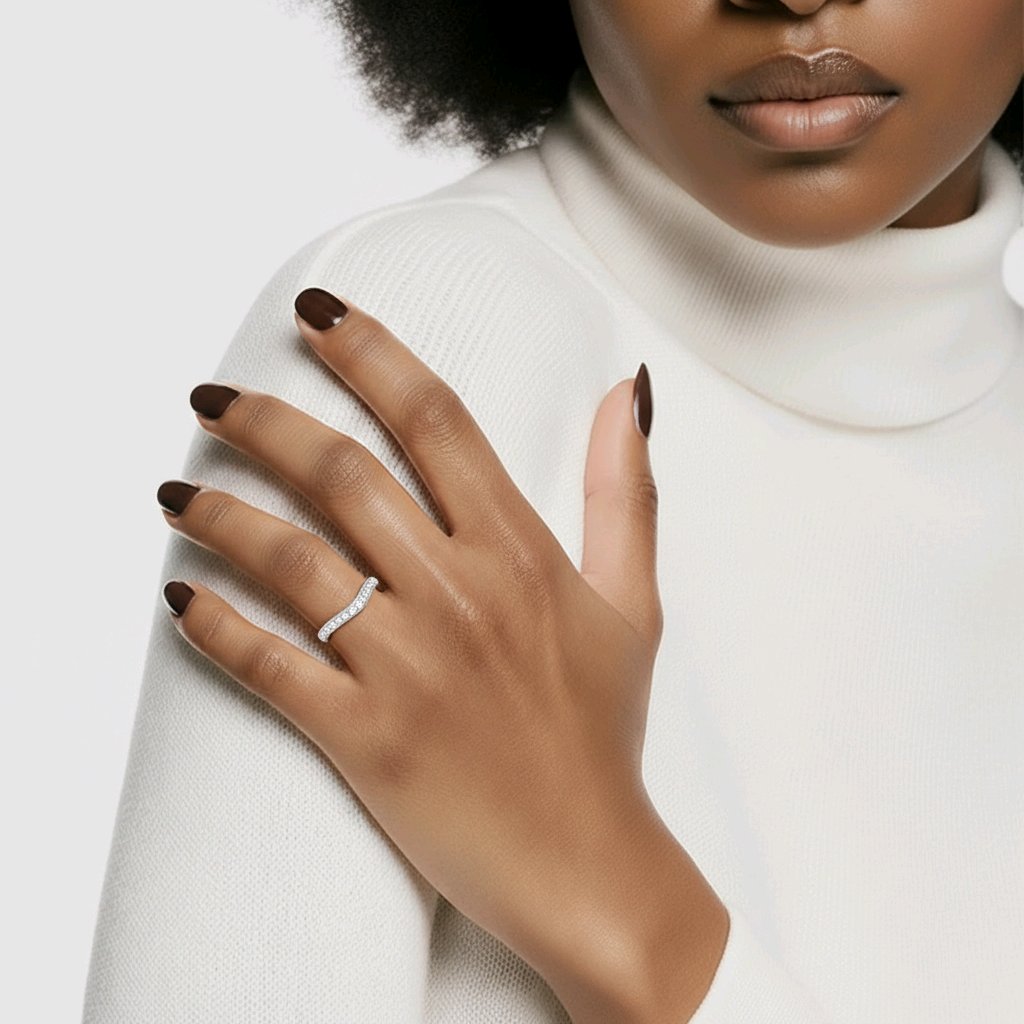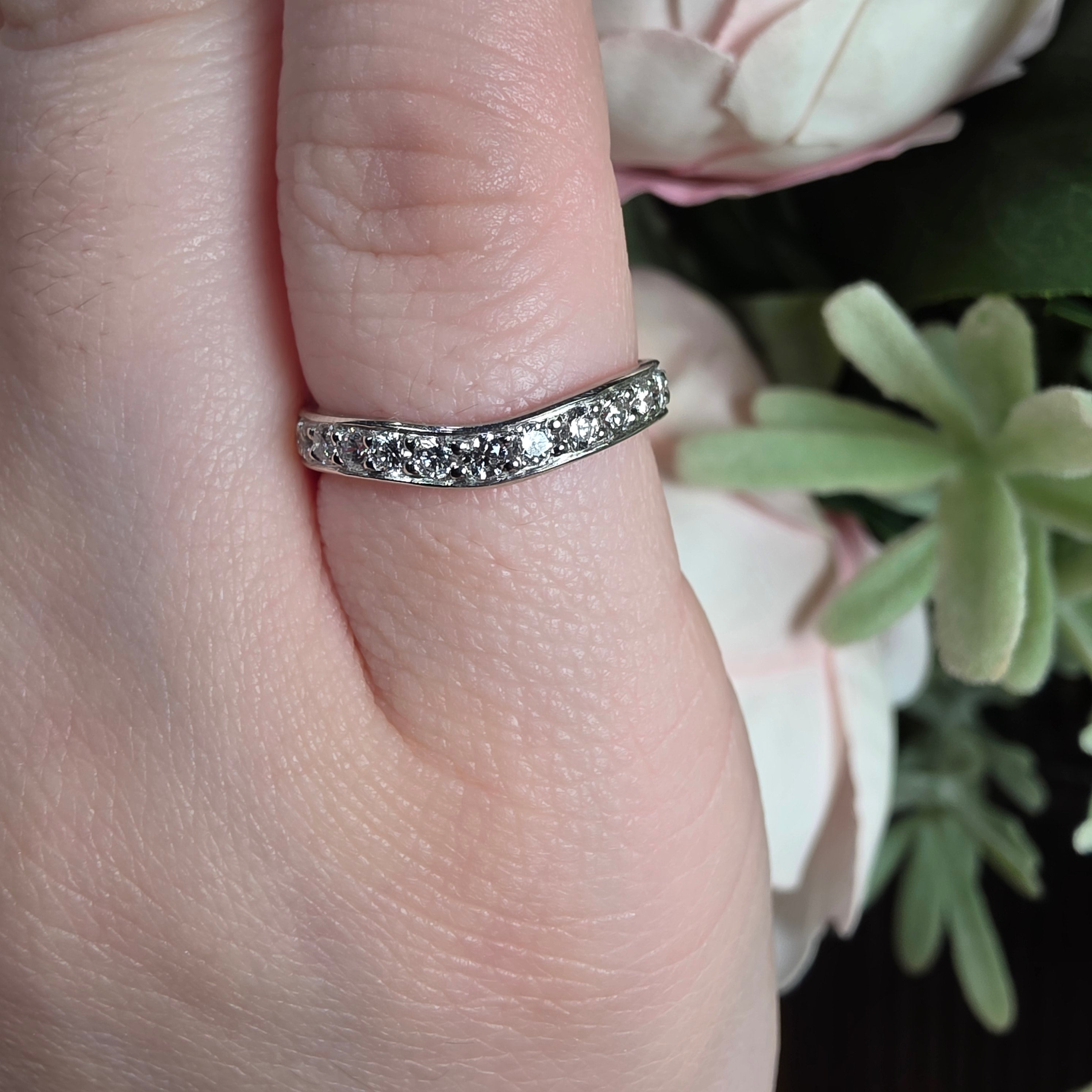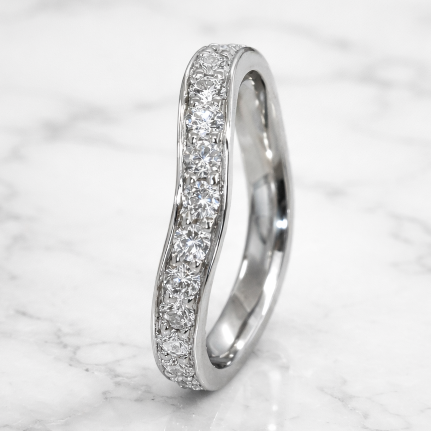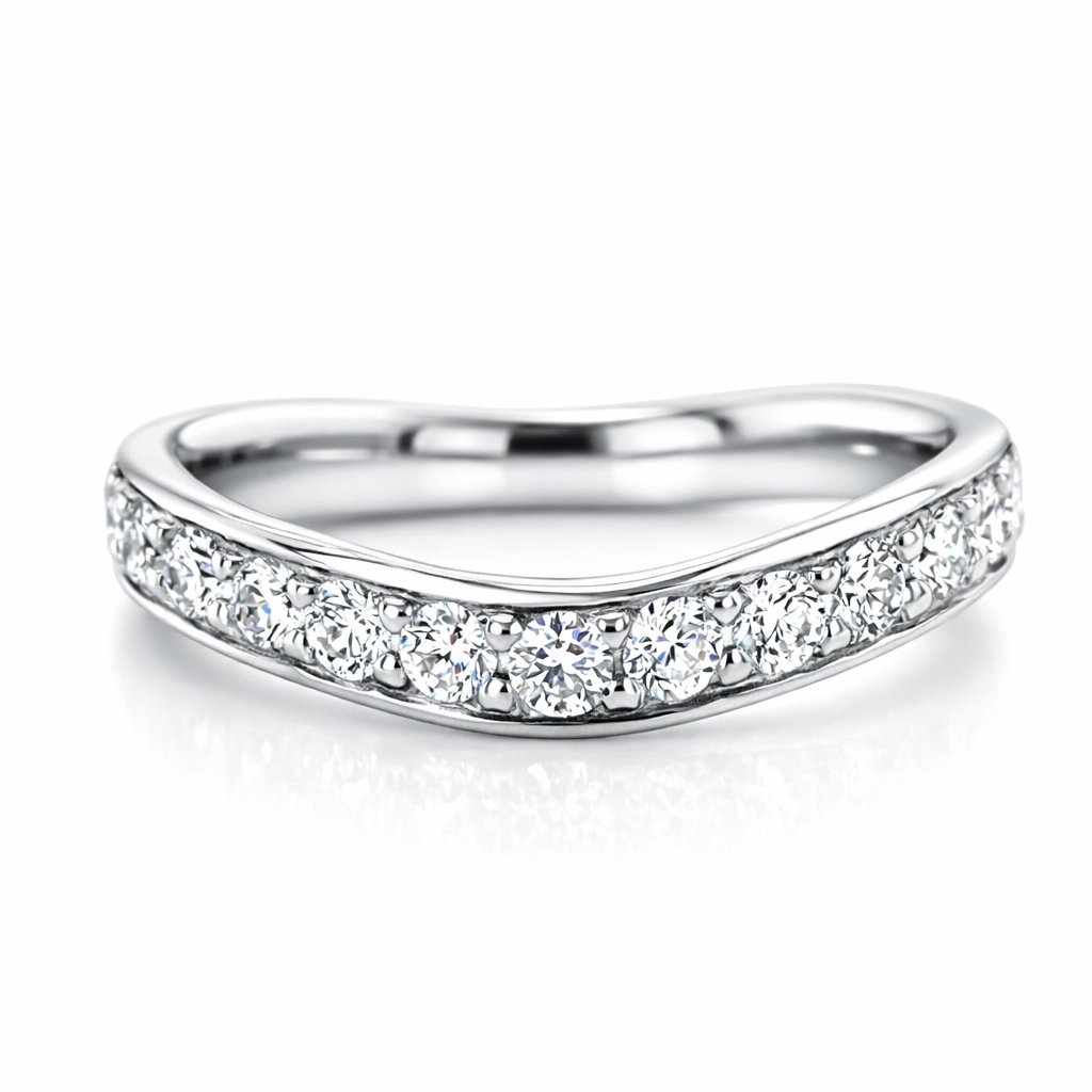 Round Brilliant Cut diamonds showcase exceptional sparkle and fire when expertly grain set into this elegant wishbone wedding band. The graceful curved design complements solitaire engagement rings beautifully, whilst the 0.40 carat total weight provides substantial presence without overwhelming the finger. Each diamond is secured using traditional grain setting, a time-honoured technique that maximises light reflection and ensures lasting durability. This refined band exemplifies timeless bridal jewellery craftsmanship, perfect for those seeking understated sophistication with genuine brilliance.