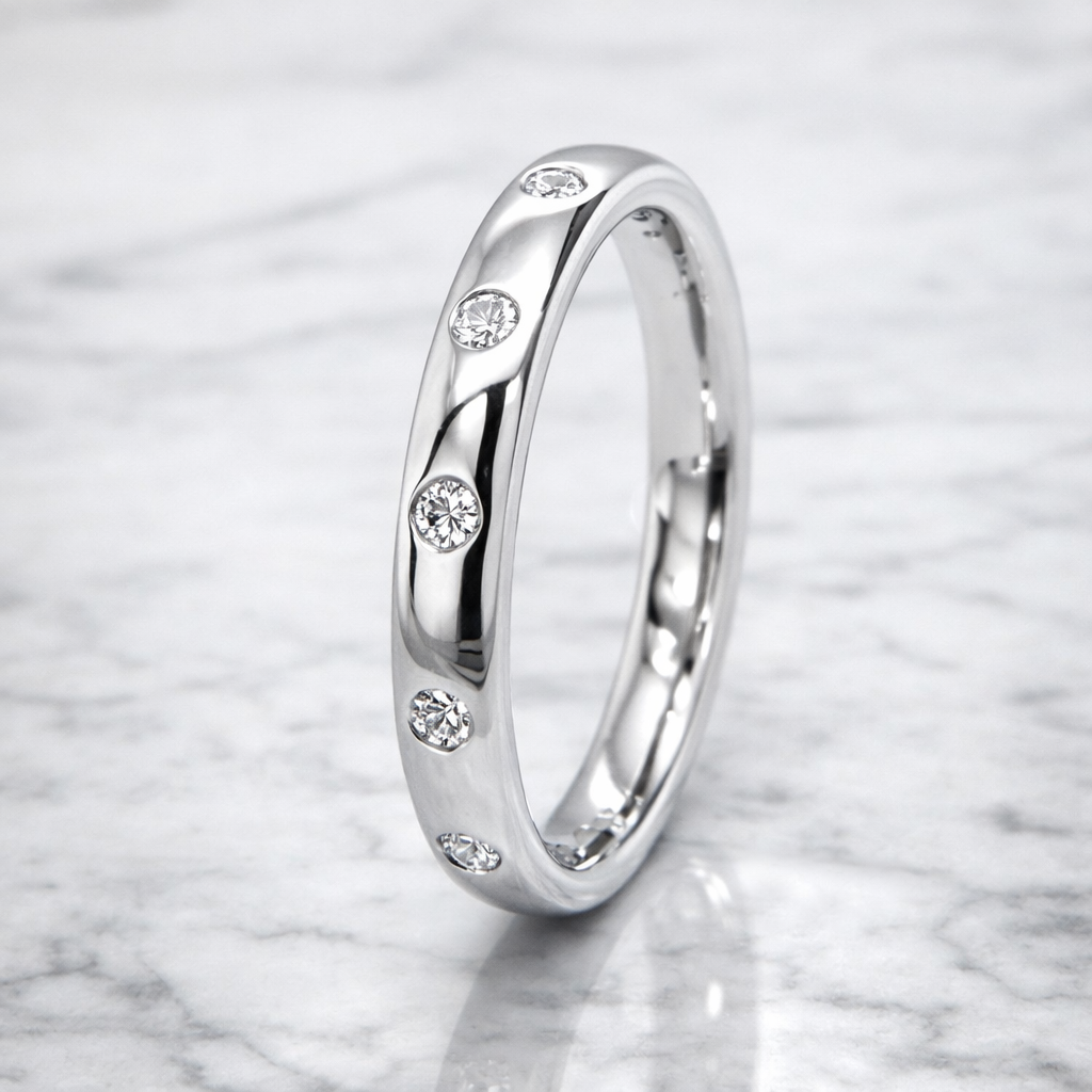 Discover timeless elegance with this exquisite Round Brilliant Cut Diamond Wedding Band, featuring 0.18 carats of carefully selected diamonds set using the sophisticated invisible setting technique. This refined design seamlessly blends classic beauty with modern craftsmanship, creating a band that catches light beautifully whilst maintaining a sleek, uninterrupted silhouette. Perfect for those seeking a distinctive alternative to traditional solitaire rings, the invisible setting showcases your diamonds with understated luxury. An investment piece that celebrates your commitment with enduring sparkle and sophistication.