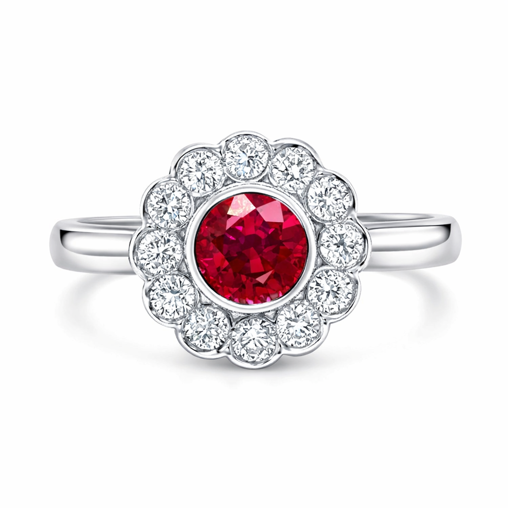 Round Brilliant Cut Ruby With Round Brilliant Cut Diamond Cluster
