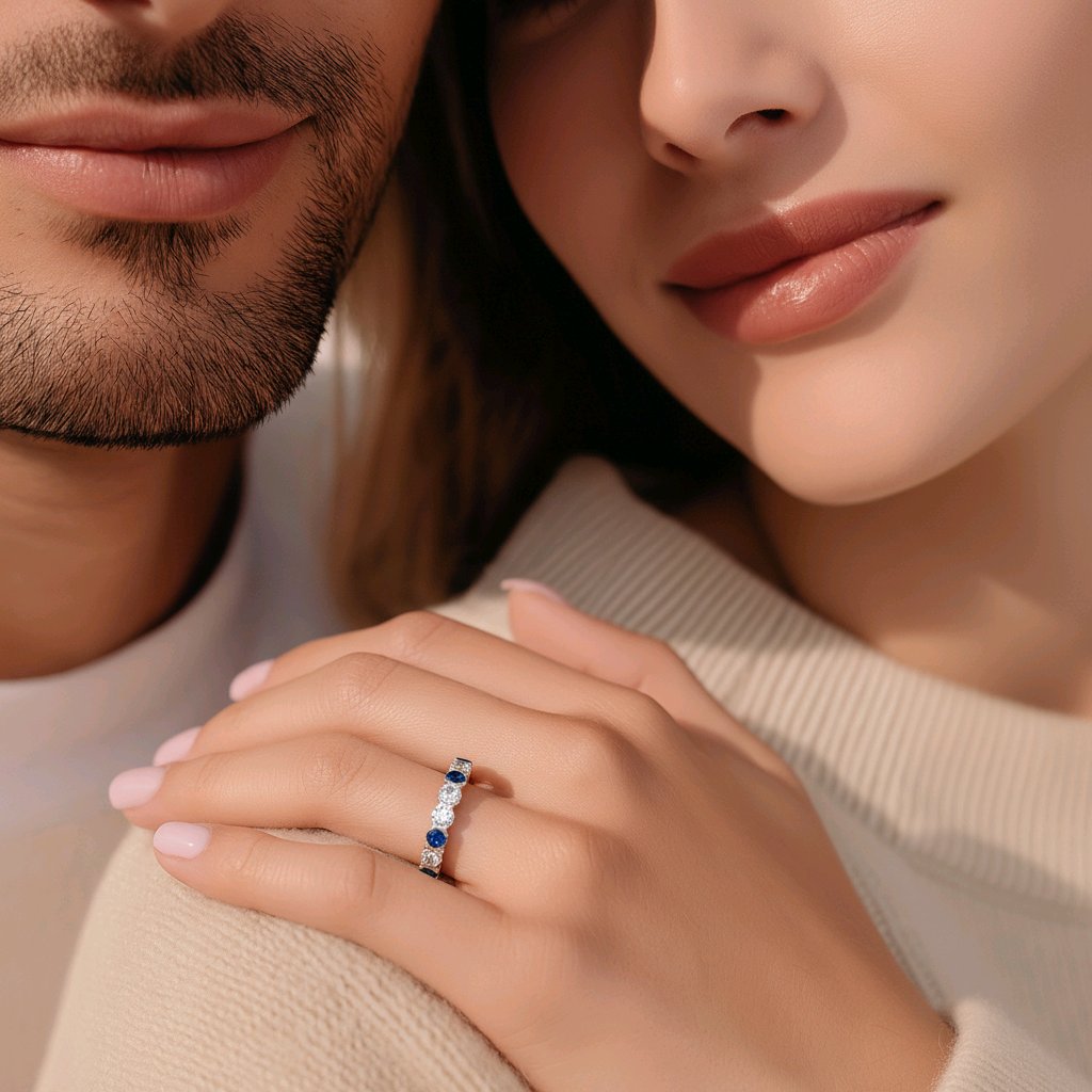 Elevate your style with our stunning Round Brilliant Cut Sapphire & Diamond 7 Stone Eternity Ring! This exquisite piece boasts a row of sparkling sapphires and diamonds, creating a timeless statement of elegance and luxury. Let the brilliance of this ring shine on your finger and enchant all who see it.