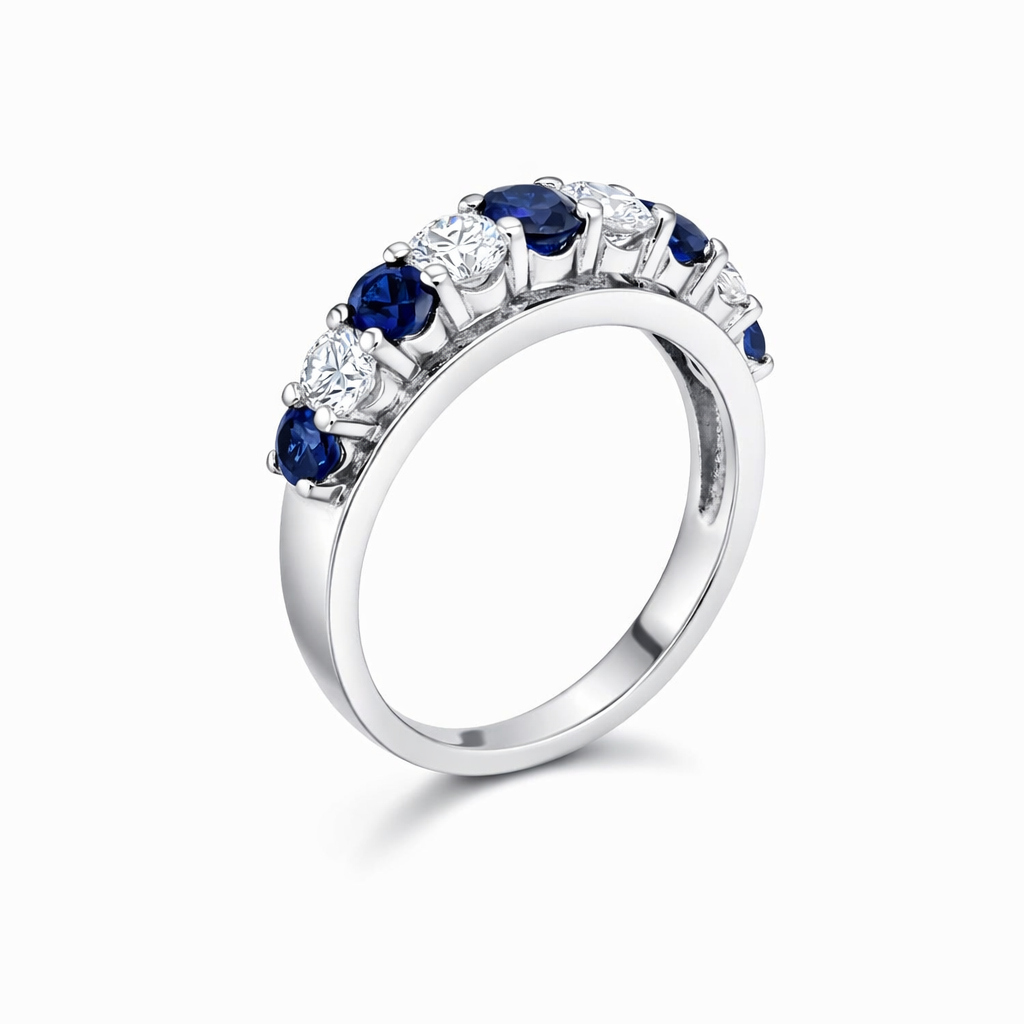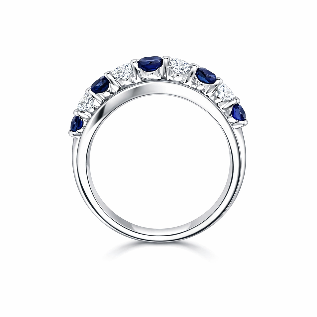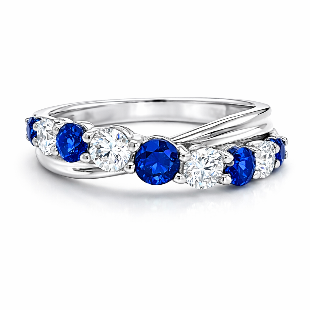 Elevate your elegance with this stunning 9-stone crossover eternity ring, featuring a mesmerizing round brilliant cut sapphire as the centrepiece, complemented by sparkling diamonds. The sophisticated crossover design creates a dynamic visual flow, while the alternating gemstones add depth and dimension to your jewellery collection. Perfect for marking life's precious moments or as a timeless everyday treasure, this ring combines classic craftsmanship with contemporary style. A true statement piece that captures light beautifully from every angle.